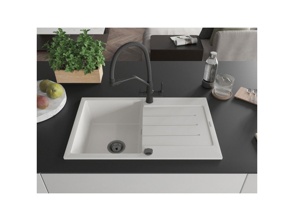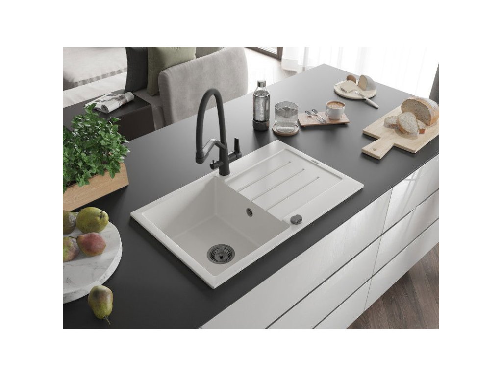 Granitový drez Mexen Bruno s 1 misou, odkapávačom a kuchynskou batériou Duo, biely - 6513-20-671701-70-B