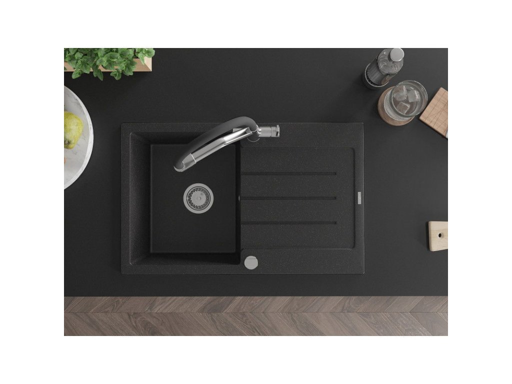 Granitový drez Mexen Bruno s 1 misou, odkapávačom a kuchynskou batériou Duo, čierna/strieborná metalíza - 6513-73-671701-07