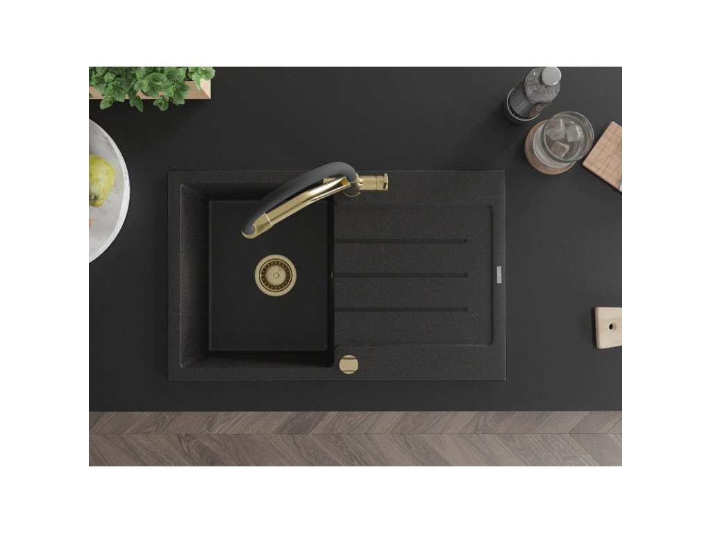 Granitový drez Mexen Bruno s 1 misou, odkapávačom a kuchynskou batériou Duo, čierna/strieborná metalíza - 6513-73-671701-57-G