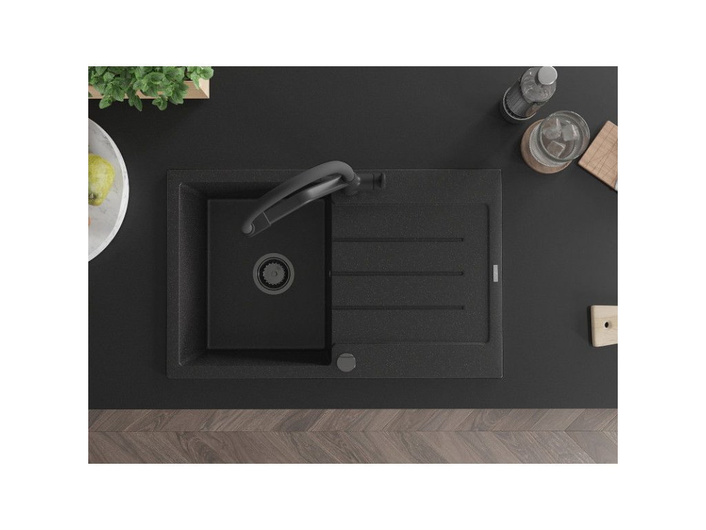 Granitový drez Mexen Bruno s 1 misou, odkapávačom a kuchynskou batériou Duo, čierna/strieborná metalíza - 6513-73-671701-70-B