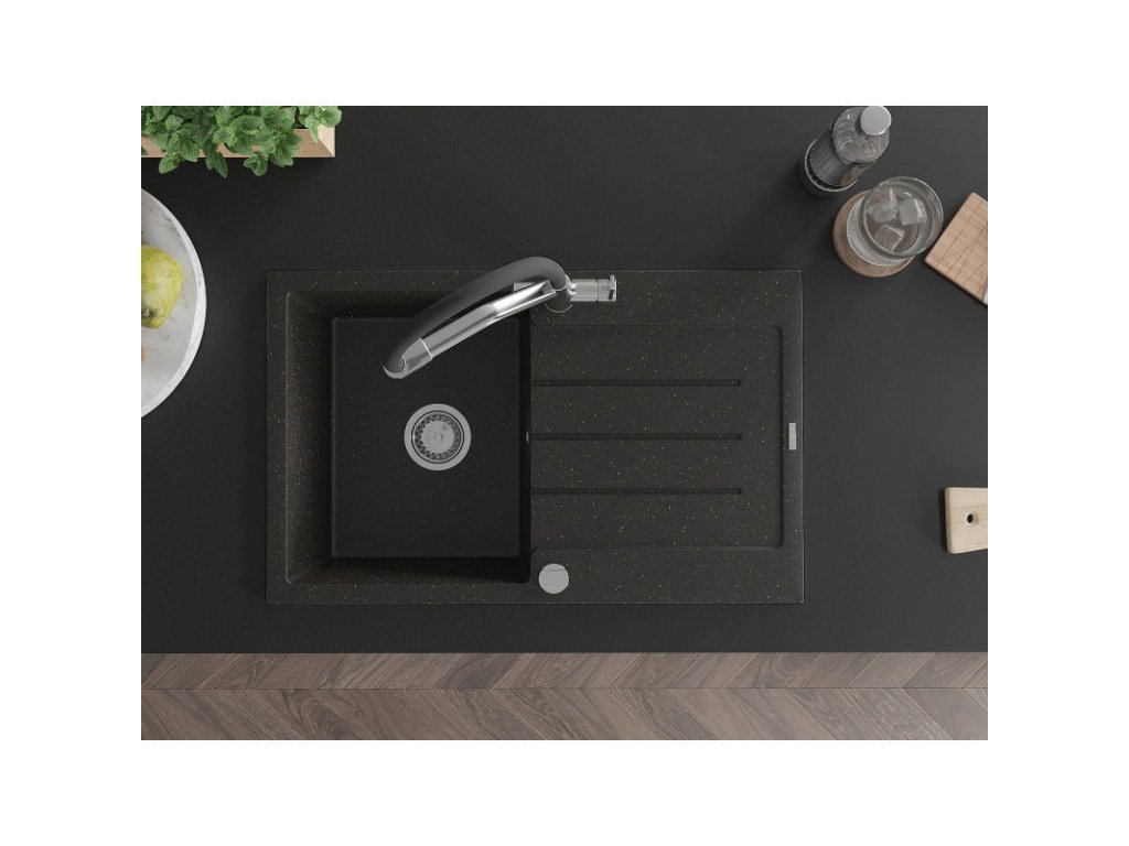 Granitový drez Mexen Bruno s 1 misou, odkapávačom a kuchynskou batériou Duo, čierna/zlatá metalíza - 6513-75-671701-07