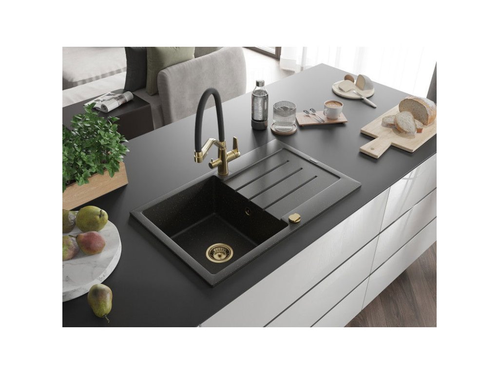 Granitový drez Mexen Bruno s 1 misou, odkapávačom a kuchynskou batériou Duo, čierna/zlatá metalíza - 6513-75-671701-57-G