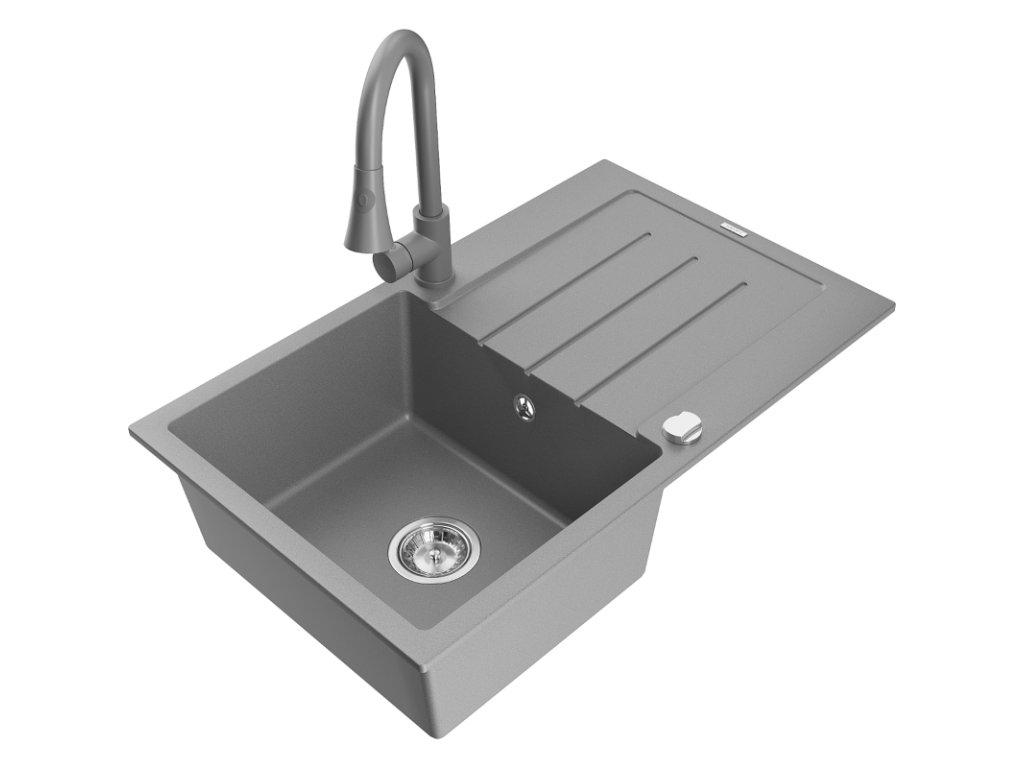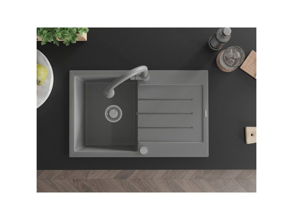 Granitový drez Mexen Bruno s 1 misou, odkapávačom a kuchynskou batériou Elia, sivý - 6513-71-670101-71