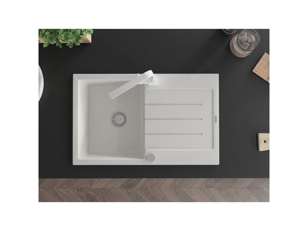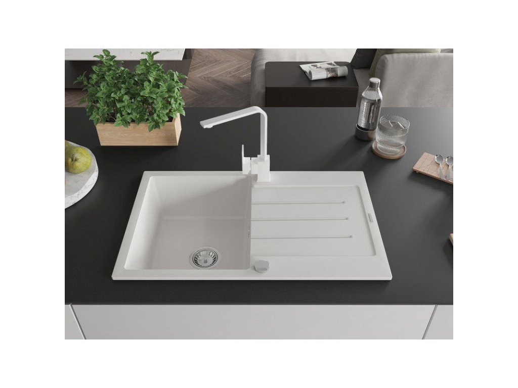 Granitový drez Mexen Bruno s 1 misou, odkapávačom a kuchynskou batériou Rita, biely - 6513-20-670300-20
