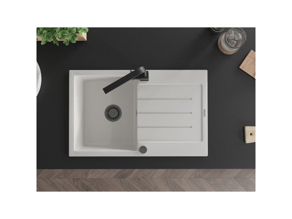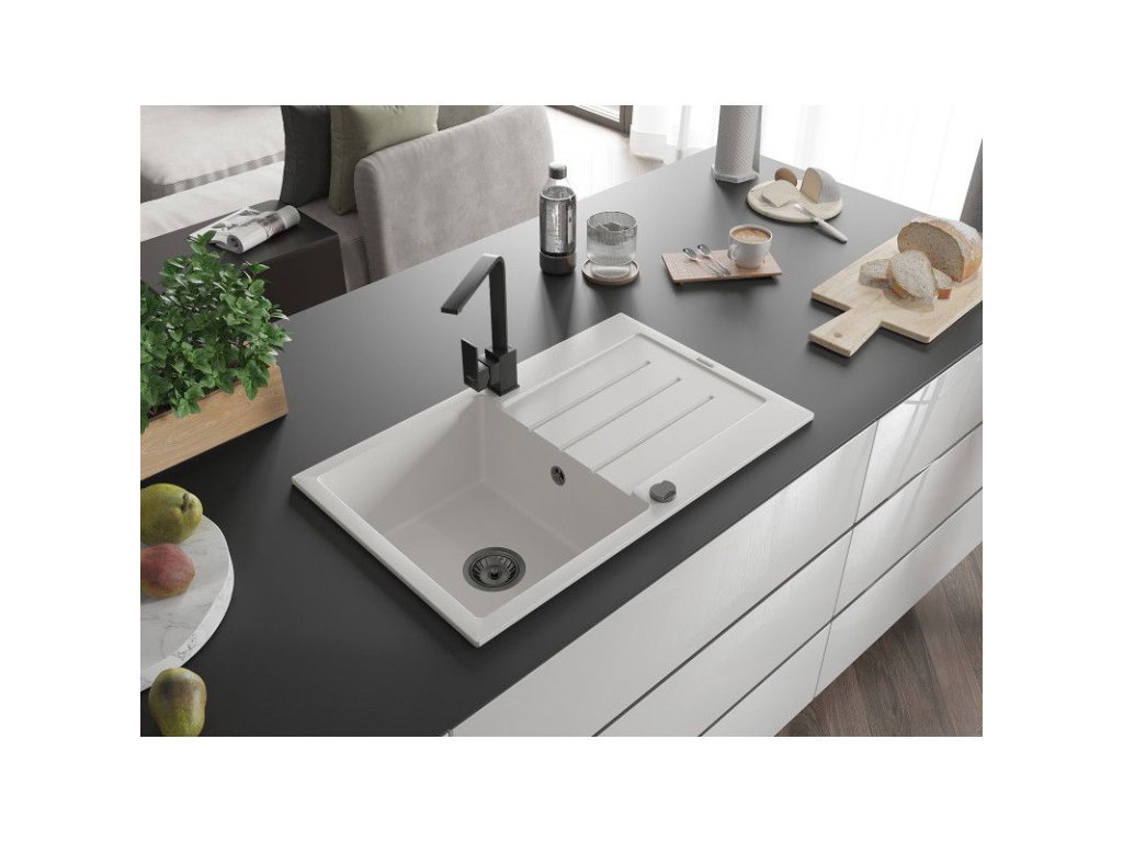 Granitový drez Mexen Bruno s 1 misou, odkapávačom a kuchynskou batériou Rita, biely - 6513-20-670300-70