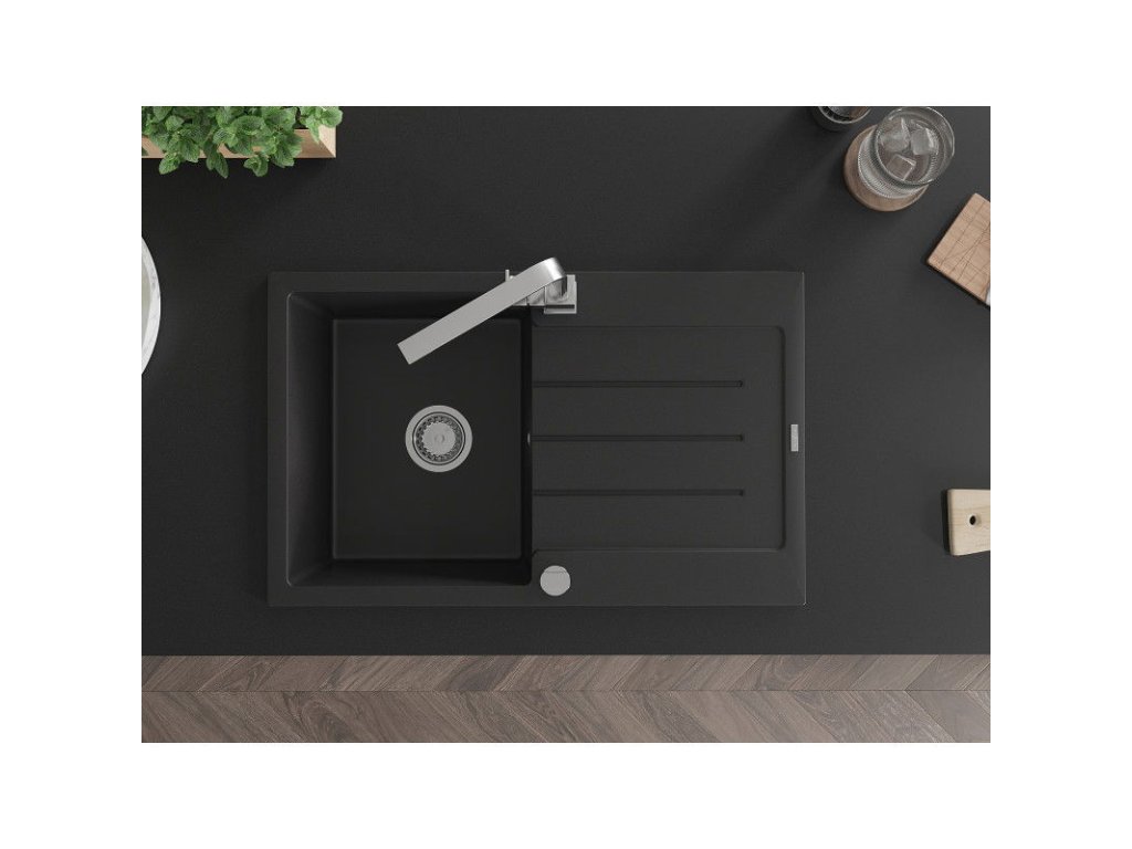 Granitový drez Mexen Bruno s 1 misou, odkapávačom a kuchynskou batériou Rita, čierny - 6513-77-670300-00