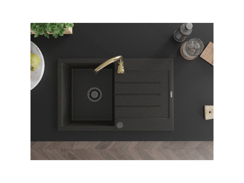 Granitový drez Mexen Bruno s 1 misou, odkapávačom a kuchynskou batériou Telma, čierna/zlatá - 6513-75-670200-50-B