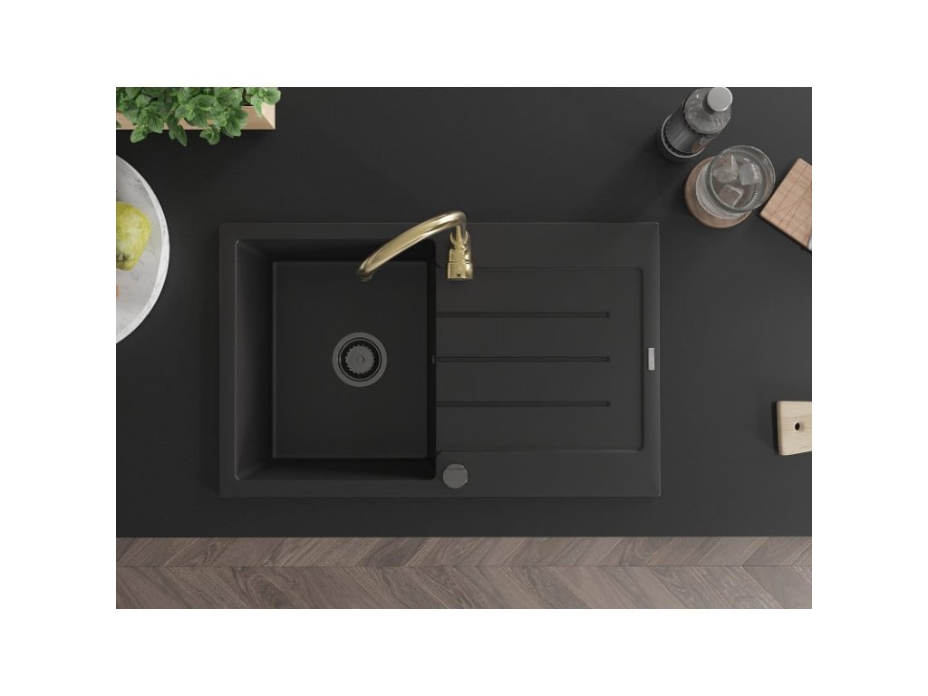 Granitový drez Mexen Bruno s 1 misou, odkapávačom a kuchynskou batériou Telma, čierny - 6513-77-670200-50-B