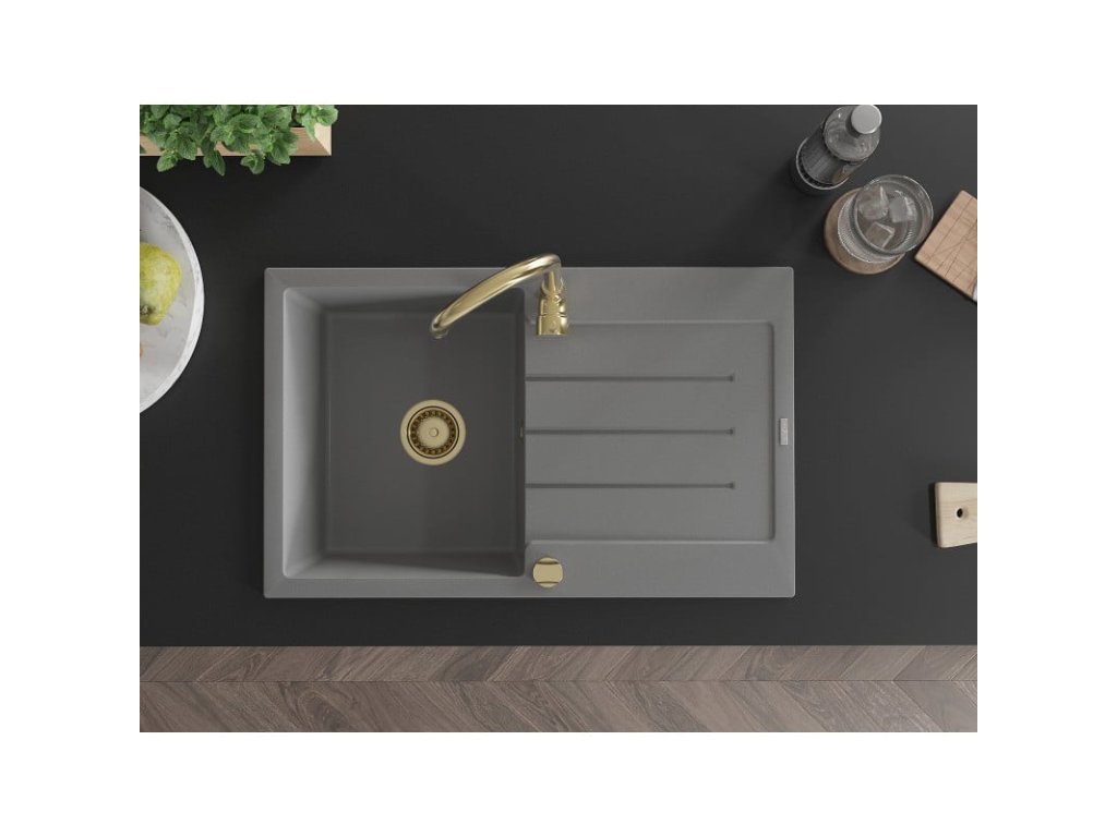 Granitový drez Mexen Bruno s 1 misou, odkapávačom a kuchynskou batériou Telma, sivý - 6513-71-670200-50