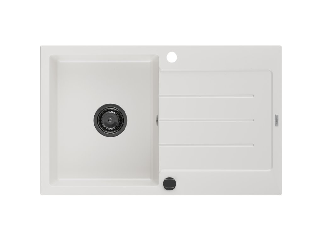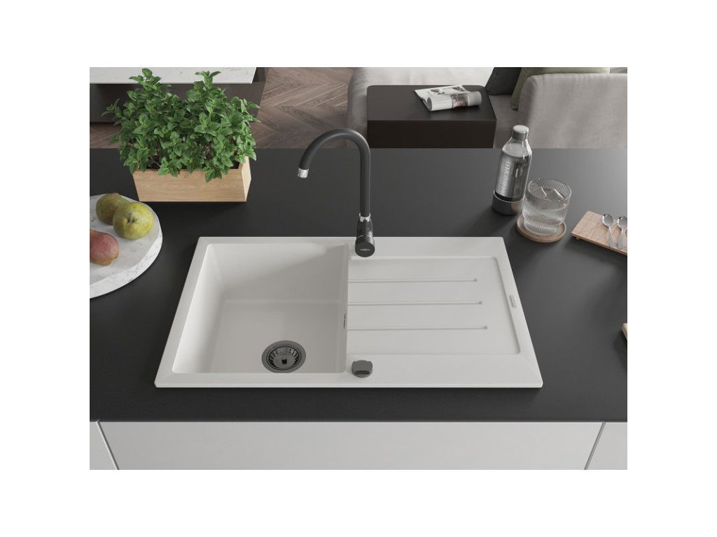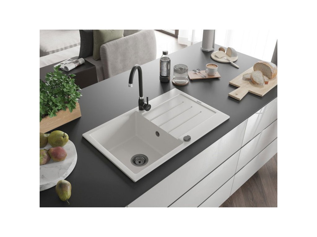 Granitový drez Mexen Bruno s 1 misou a odkapávačom 795 x 495 mm, biely, čierny sifón - 6513791010-20-B