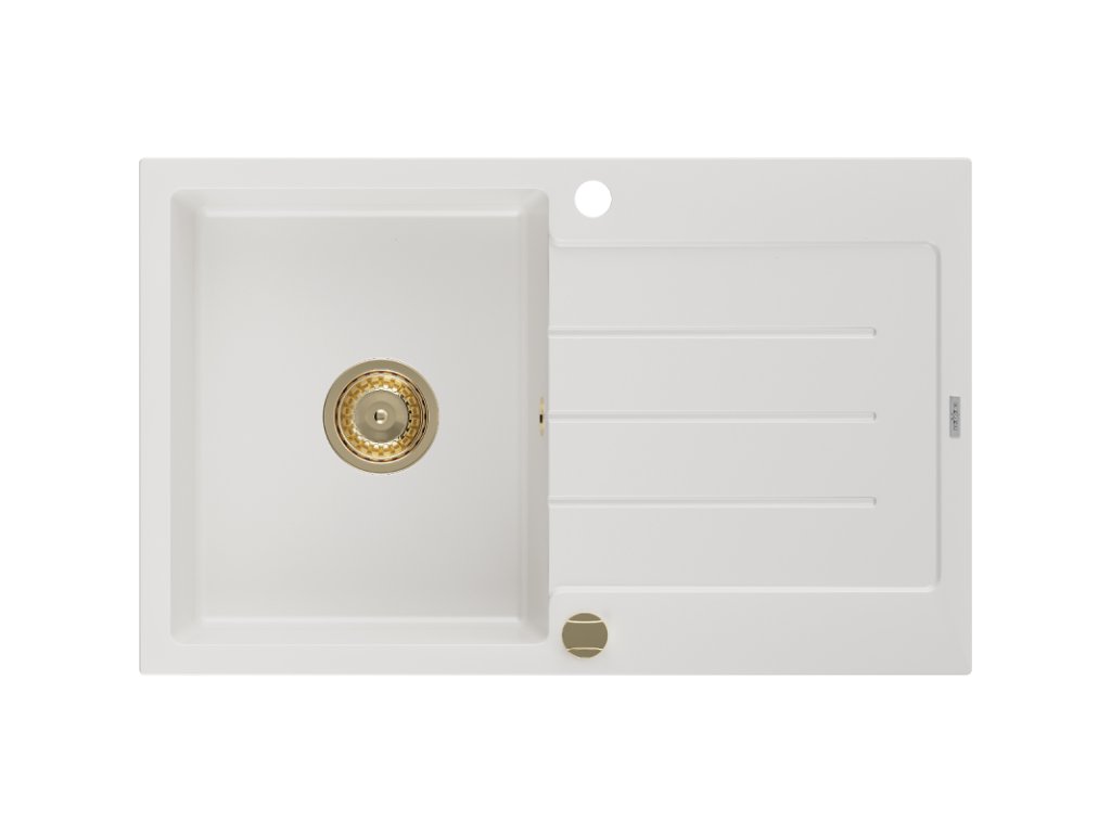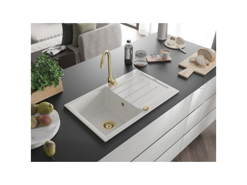 Granitový drez Mexen Bruno s 1 misou a odkapávačom 795 x 495 mm, biely, zlatý sifón - 6513791010-20-G