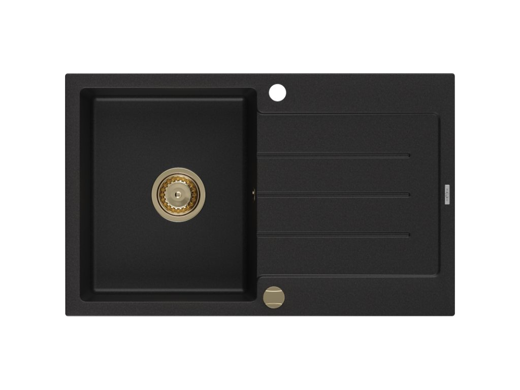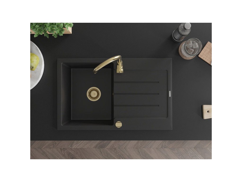 Granitový drez Mexen Bruno s 1 misou a odkapávačom 795 x 495 mm, čierny, zlatý sifón - 6513791010-77-G