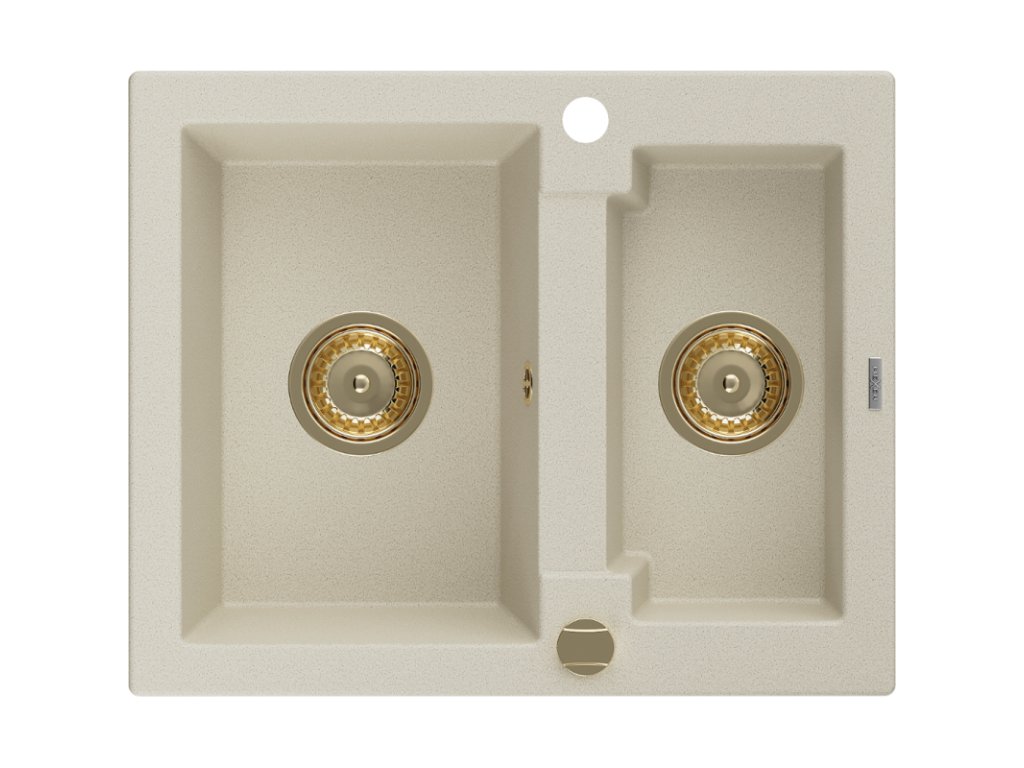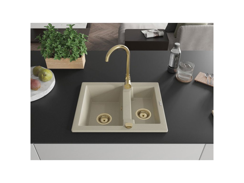 Granitový drez Mexen Carlos s 1,5 miskou 582 x 475 mm, béžový, zlatý sifón - 6518581500-69-G