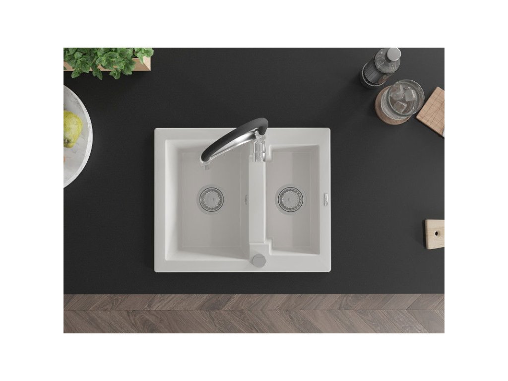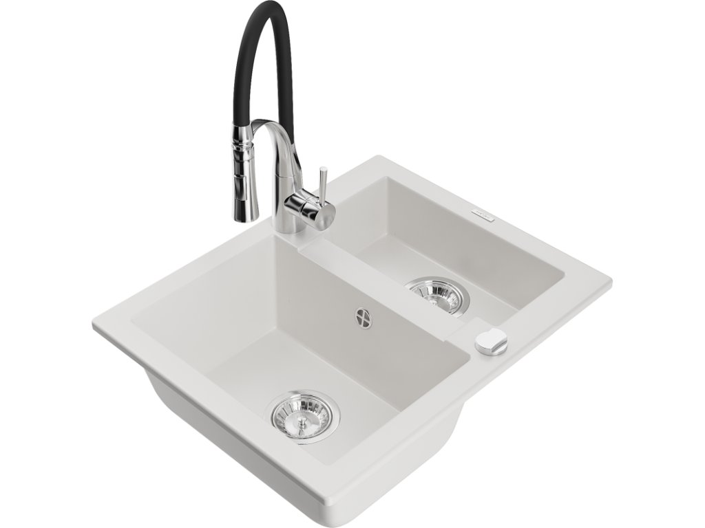Granitový drez Mexen Carlos s 1,5 miskou a kuchynskou batériou Aster, biely - 6518-20-73450-07