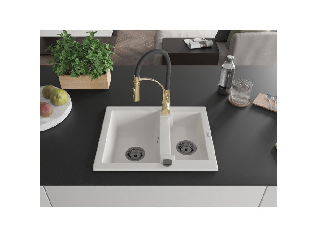 Granitový drez Mexen Carlos s 1,5 miskou a kuchynskou batériou Aster, biely - 6518-20-73450-57-B