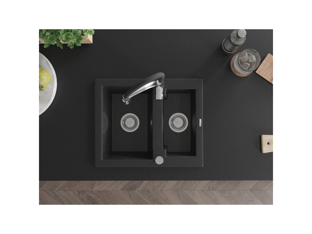 Granitový drez Mexen Carlos s 1,5 miskou a kuchynskou batériou Aster, čierna/strieborná metalíza - 6518-73-73450-07