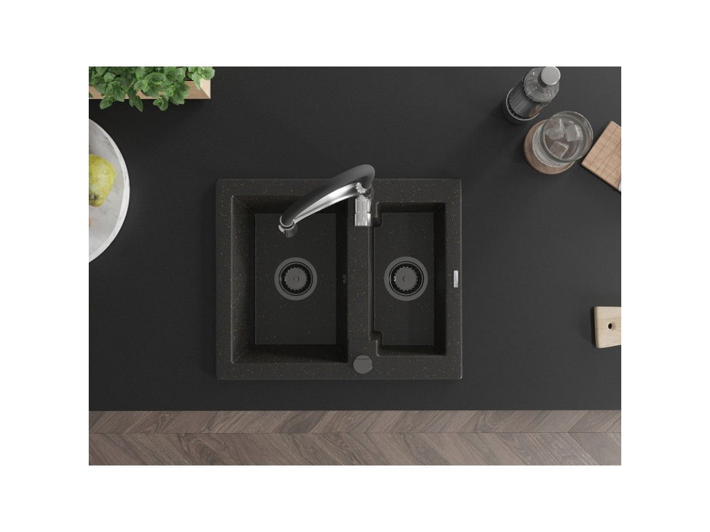 Granitový drez Mexen Carlos s 1,5 miskou a kuchynskou batériou Aster, čierna/zlatá metalíza - 6518-75-73450-07-B