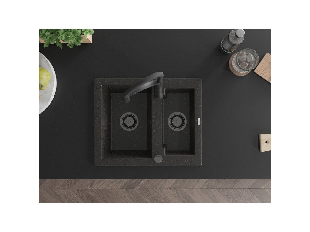 Granitový drez Mexen Carlos s 1,5 miskou a kuchynskou batériou Aster, čierna/zlatá metalíza - 6518-75-73450-70-B