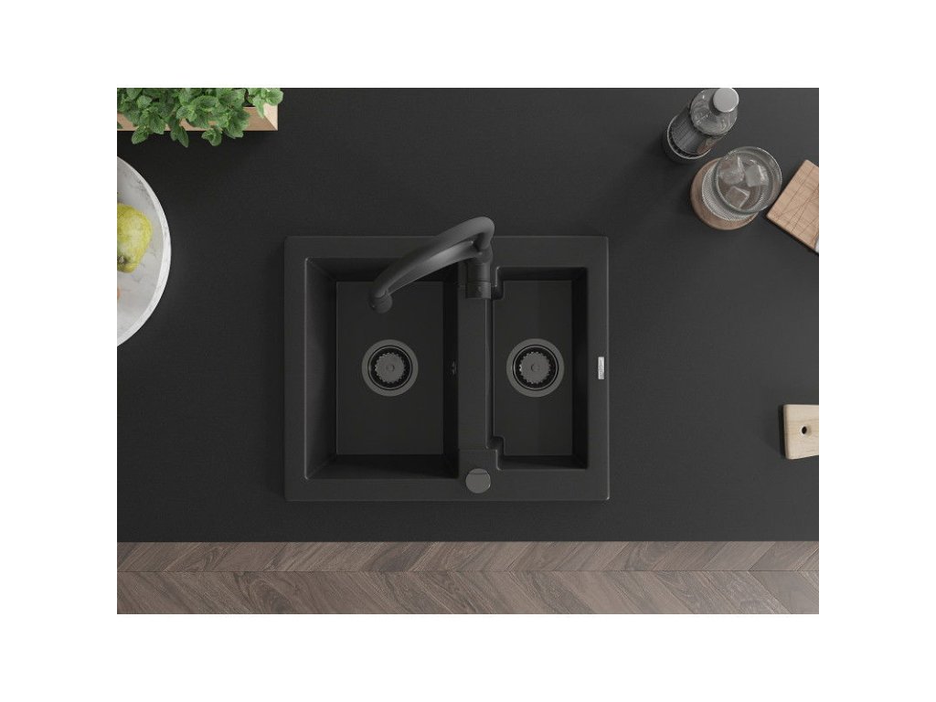 Granitový drez Mexen Carlos s 1,5 miskou a kuchynskou batériou Aster, čierny - 6518-77-73450-70-B