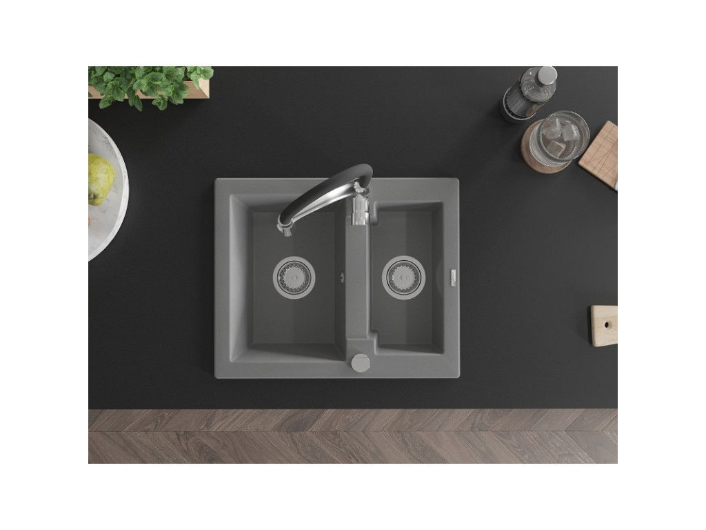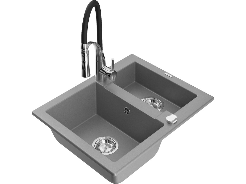 Granitový drez Mexen Carlos s 1,5 miskou a kuchynskou batériou Aster, sivý - 6518-71-73450-07