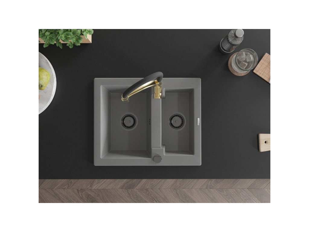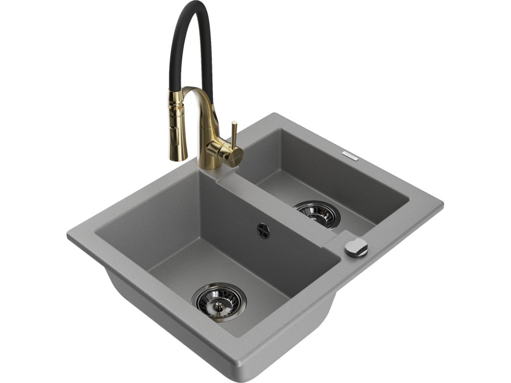 Granitový drez Mexen Carlos s 1,5 miskou a kuchynskou batériou Aster, sivý - 6518-71-73450-57-B