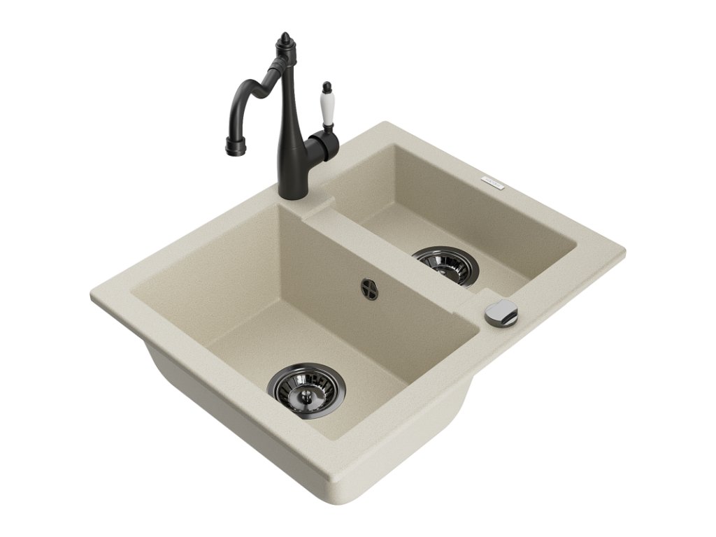 Granitový drez Mexen Carlos s 1,5 miskou a kuchynskou batériou Carla, béžový - 6518-69-670700-70