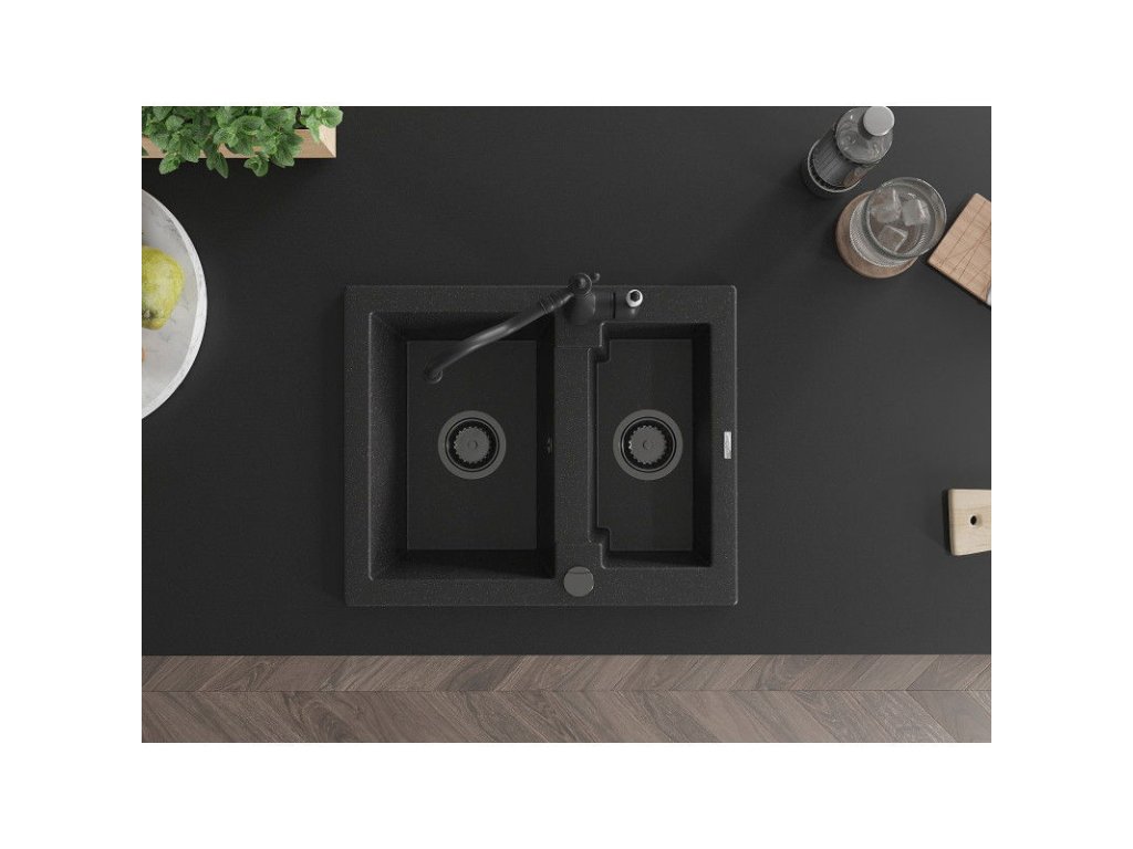 Granitový drez Mexen Carlos s 1,5 miskou a kuchynskou batériou Carla, čierna/strieborná metalíza - 6518-73-670700-70-B