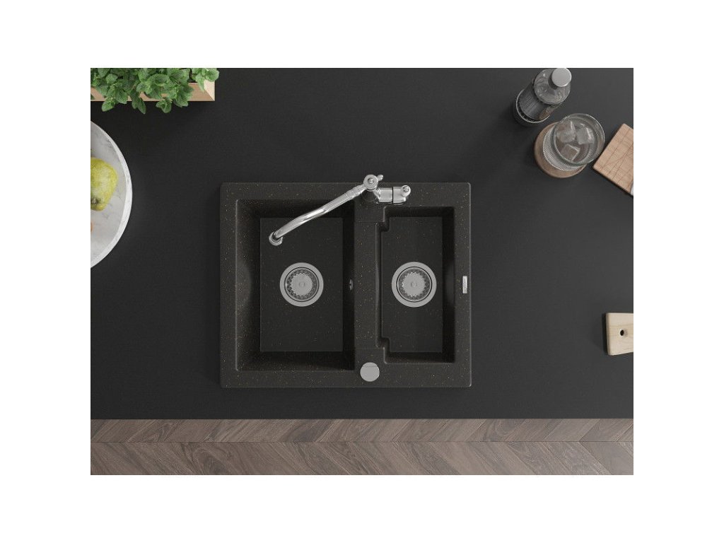Granitový drez Mexen Carlos s 1,5 miskou a kuchynskou batériou Carla, čierna/zlatá metalíza - 6518-75-670700-00