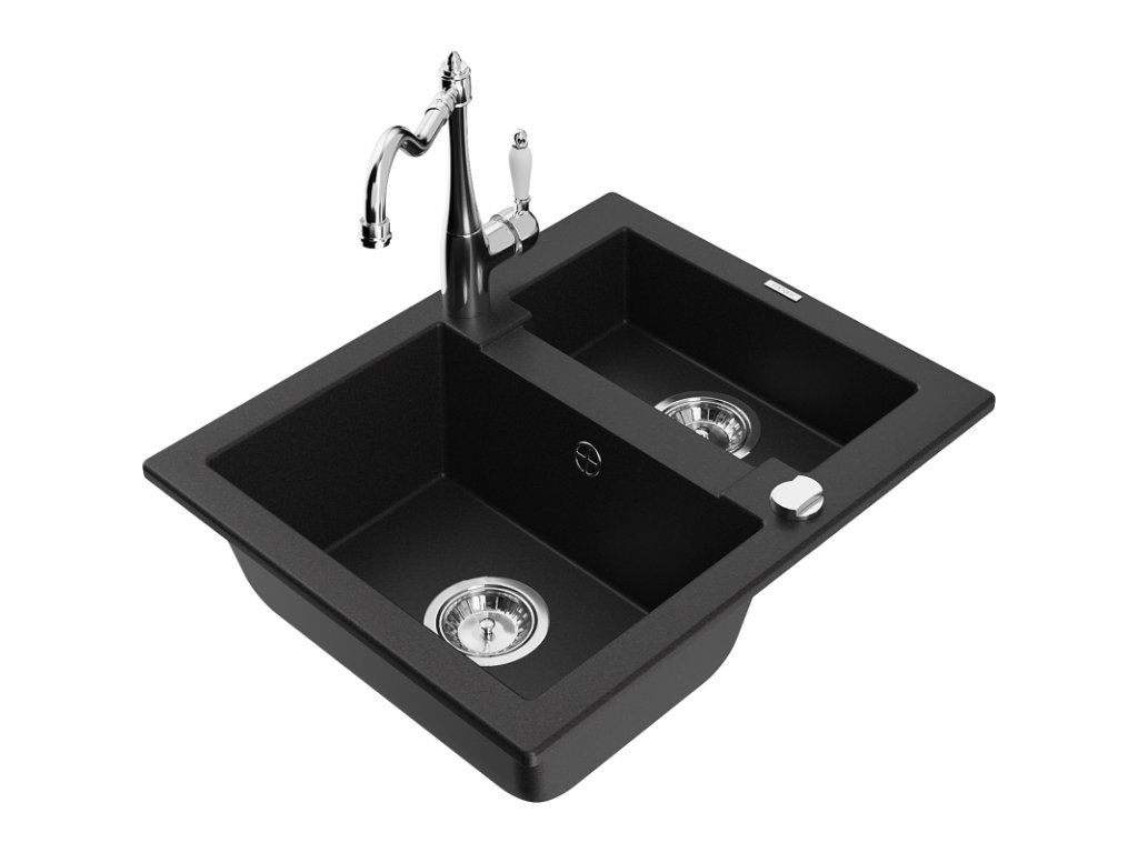 Granitový drez Mexen Carlos s 1,5 miskou a kuchynskou batériou Carla, čierny - 6518-77-670700-00