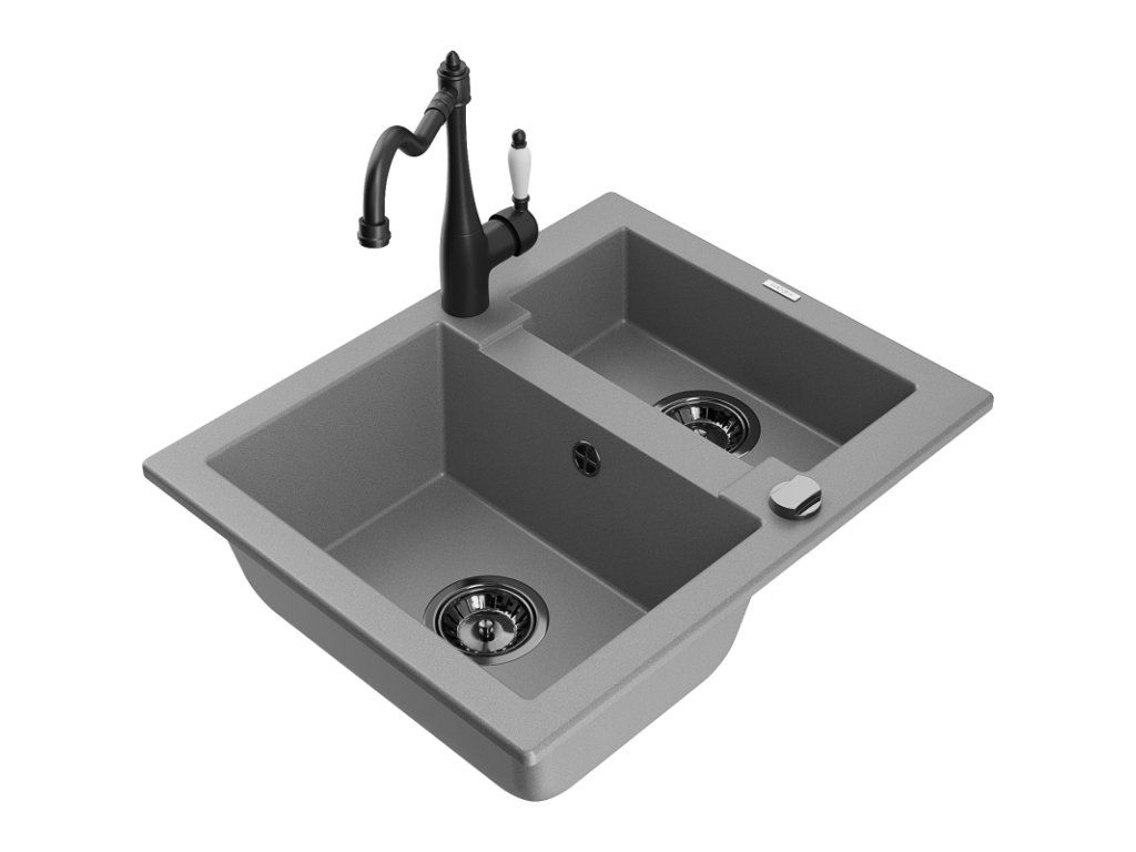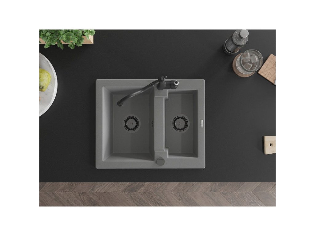 Granitový drez Mexen Carlos s 1,5 miskou a kuchynskou batériou Carla, sivý - 6518-71-670700-70-B