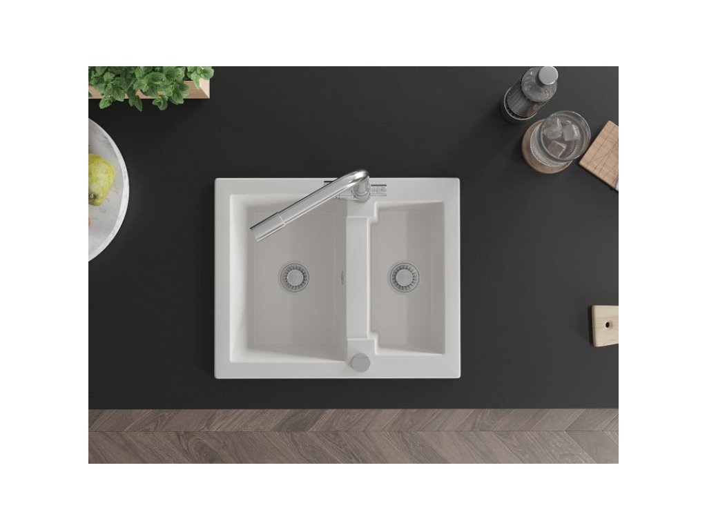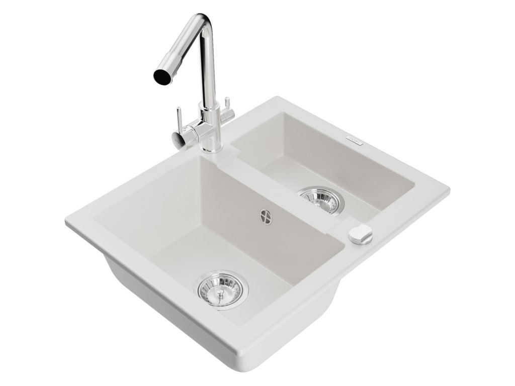Granitový drez Mexen Carlos s 1,5 miskou a kuchynskou batériou Duero, biely - 6518-20-671600-00