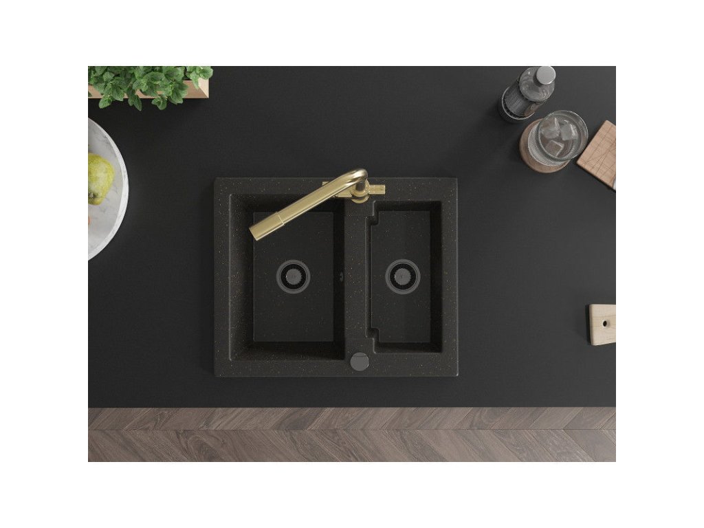 Granitový drez Mexen Carlos s 1,5 miskou a kuchynskou batériou Duero, čierna/zlatá metalíza - 6518-75-671600-50-B