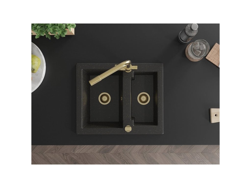 Granitový drez Mexen Carlos s 1,5 miskou a kuchynskou batériou Duero, čierna/zlatá metalíza - 6518-75-671600-50