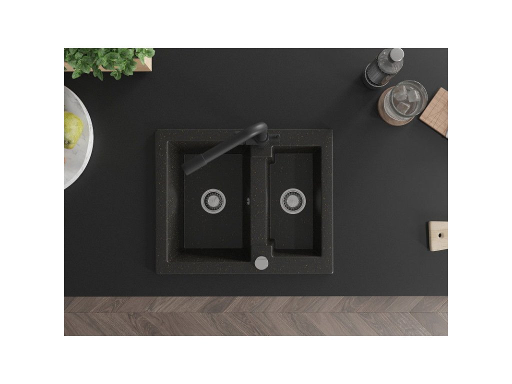 Granitový drez Mexen Carlos s 1,5 miskou a kuchynskou batériou Duero, čierna/zlatá metalíza - 6518-75-671600-70