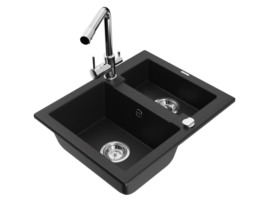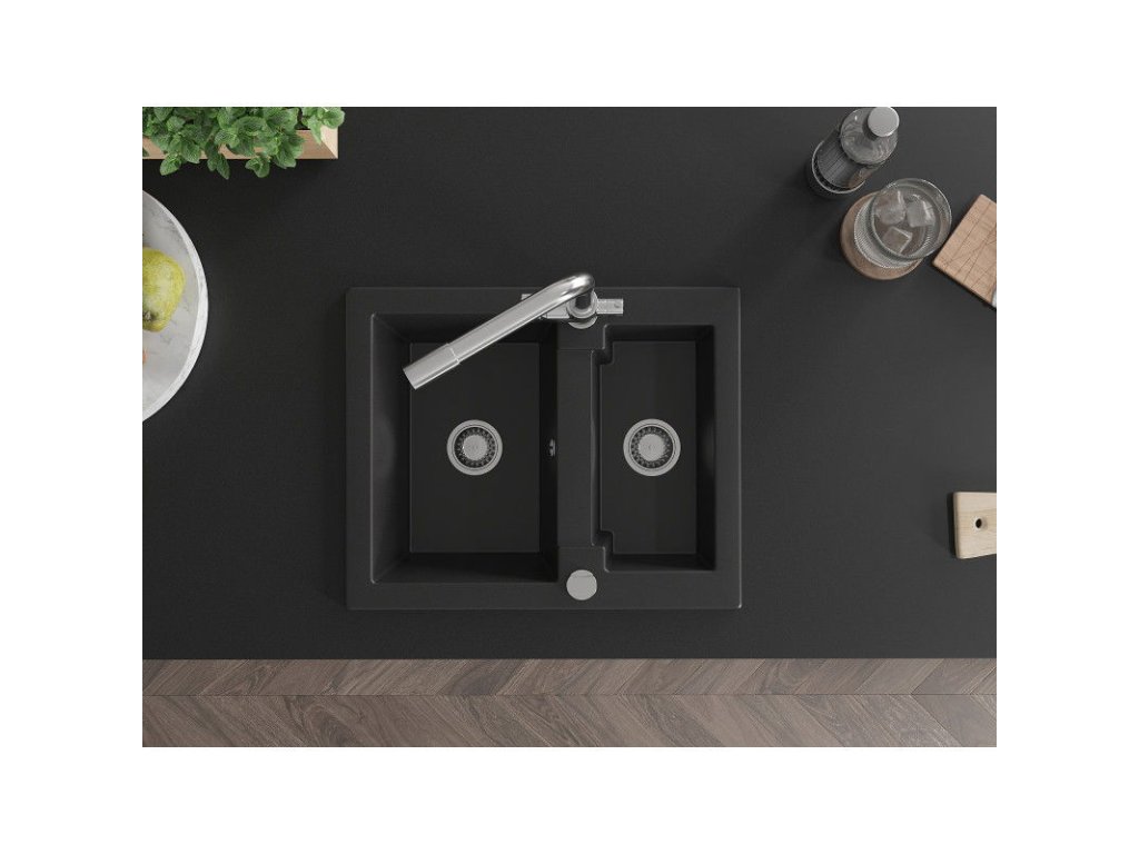Granitový drez Mexen Carlos s 1,5 miskou a kuchynskou batériou Duero, čierny - 6518-77-671600-00