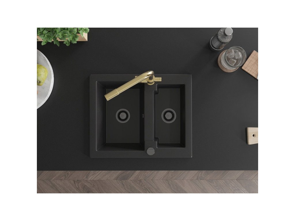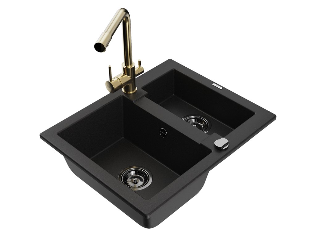 Granitový drez Mexen Carlos s 1,5 miskou a kuchynskou batériou Duero, čierny - 6518-77-671600-50-B