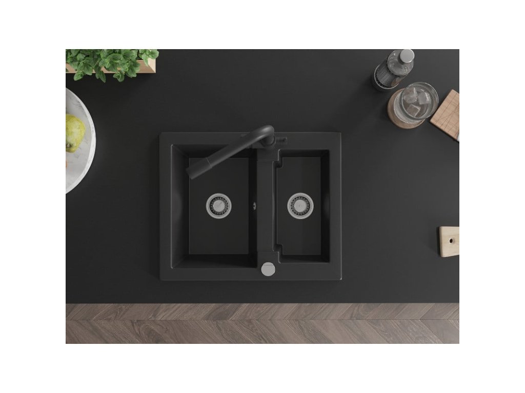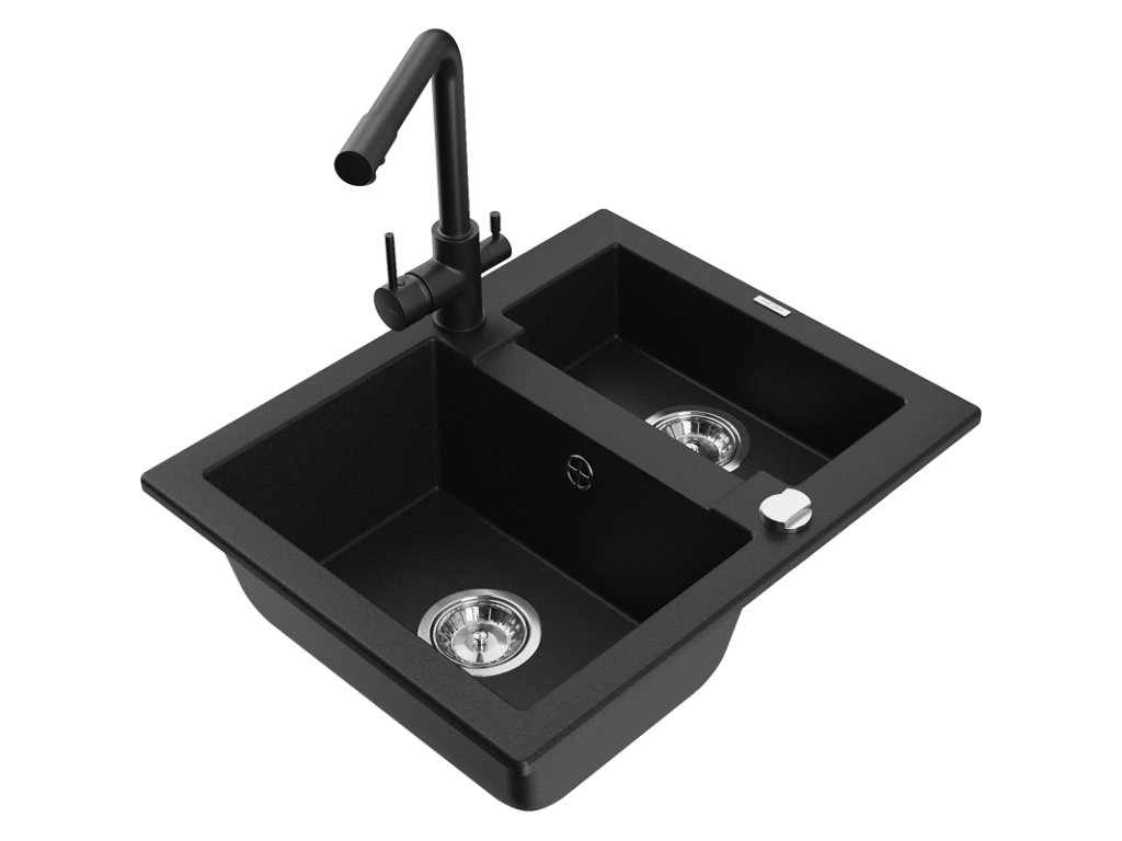 Granitový drez Mexen Carlos s 1,5 miskou a kuchynskou batériou Duero, čierny - 6518-77-671600-70