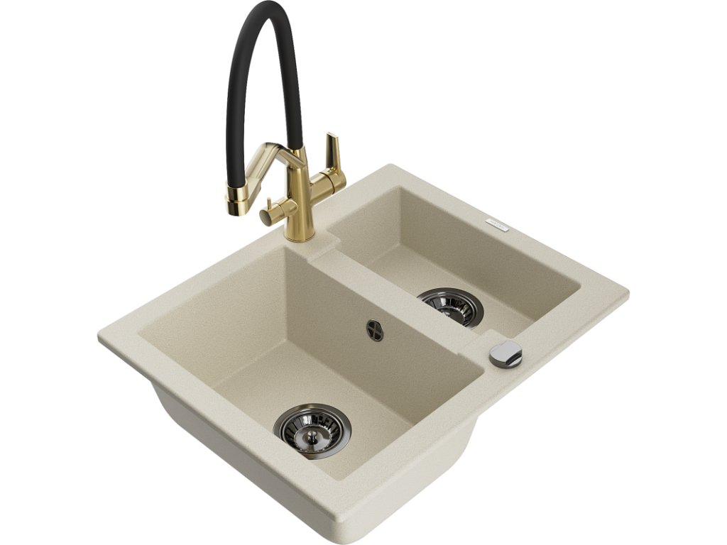 Granitový drez Mexen Carlos s 1,5 miskou a kuchynskou batériou Duo, béžový - 6518-69-671701-57-B