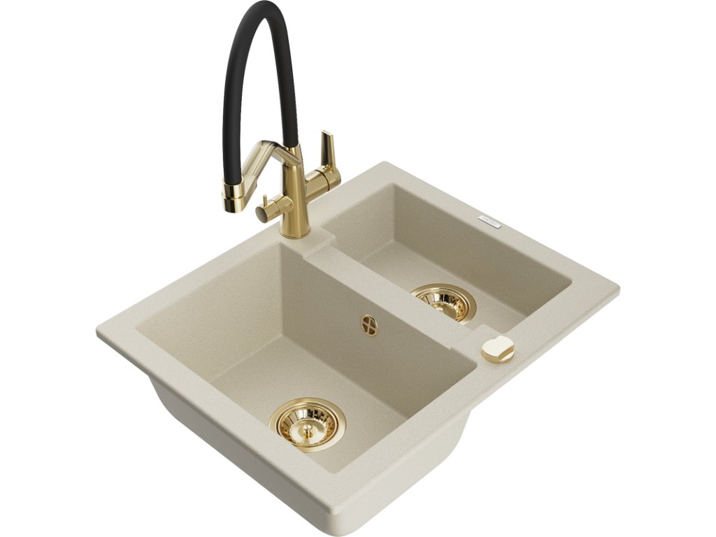 Granitový drez Mexen Carlos s 1,5 miskou a kuchynskou batériou Duo, béžový - 6518-69-671701-57-G
