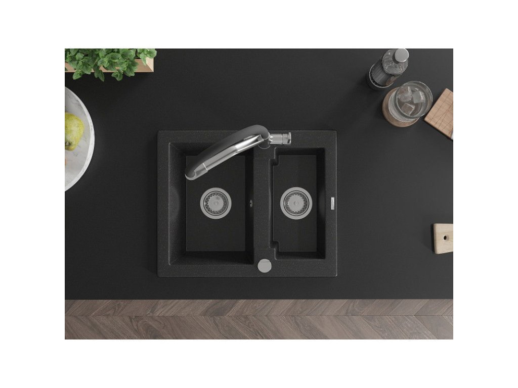 Granitový drez Mexen Carlos s 1,5 miskou a kuchynskou batériou Duo, čierna/strieborná metalíza - 6518-73-671701-07