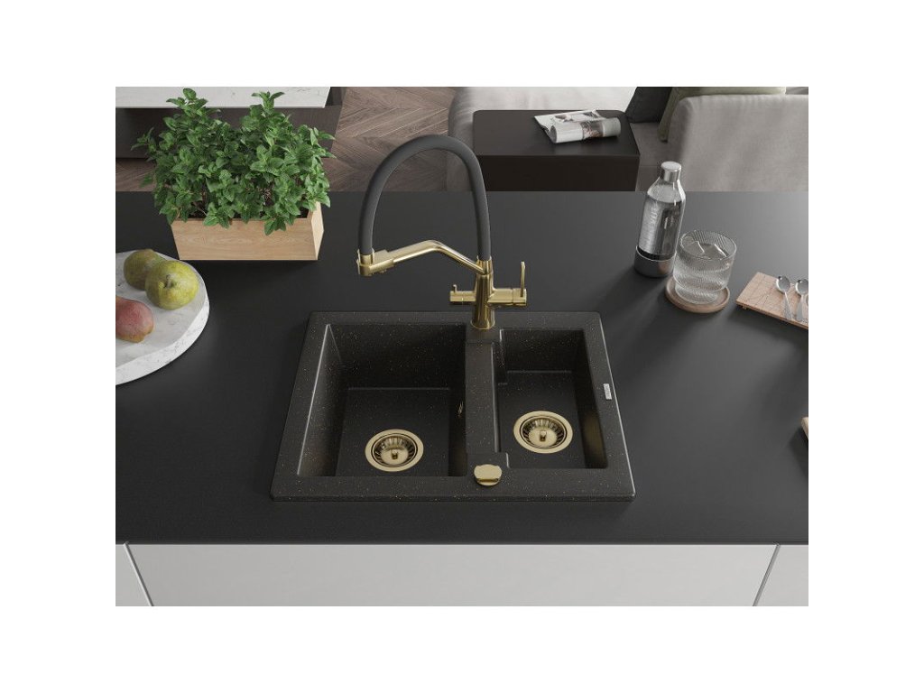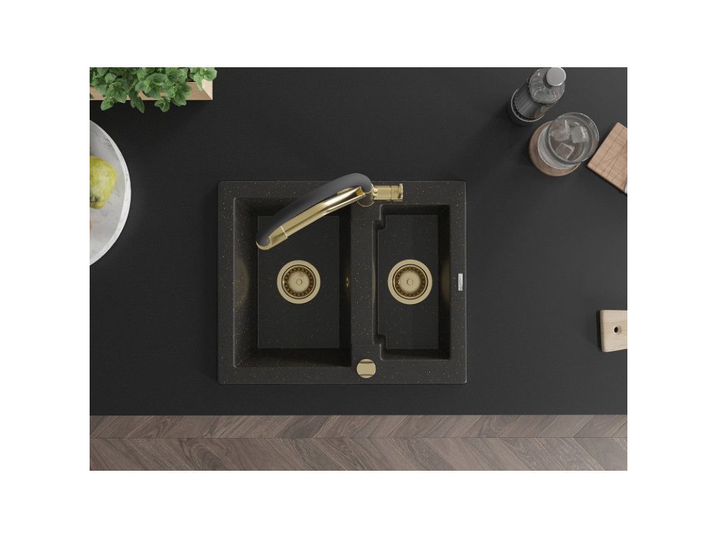 Granitový drez Mexen Carlos s 1,5 miskou a kuchynskou batériou Duo, čierna/zlatá metalíza - 6518-75-671701-57-G