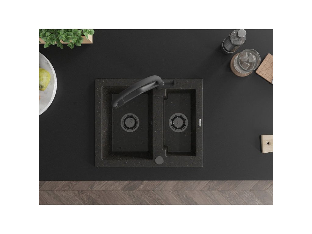Granitový drez Mexen Carlos s 1,5 miskou a kuchynskou batériou Duo, čierna/zlatá metalíza - 6518-75-671701-70-B