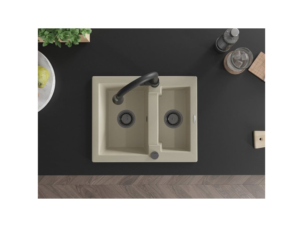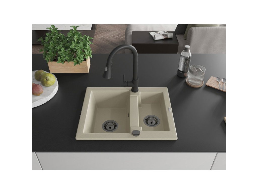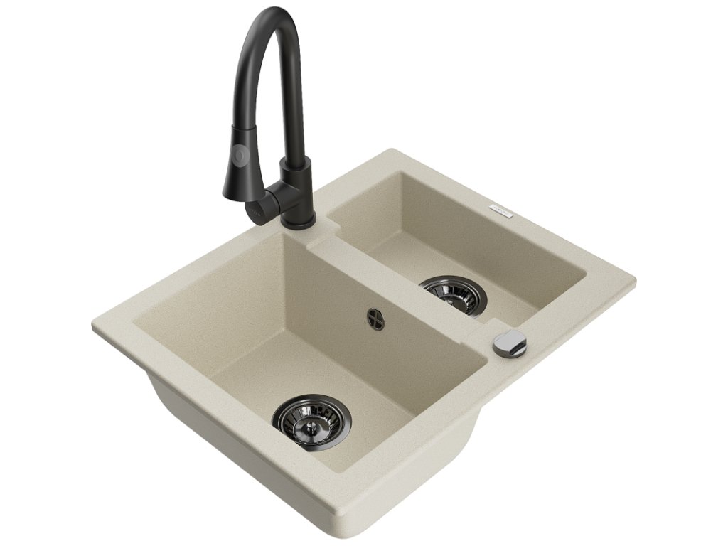 Granitový drez Mexen Carlos s 1,5 miskou a kuchynskou batériou Elia, béžový - 6518-69-670101-70