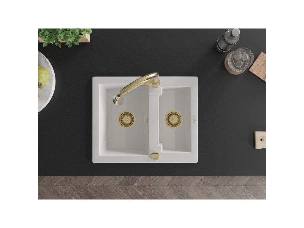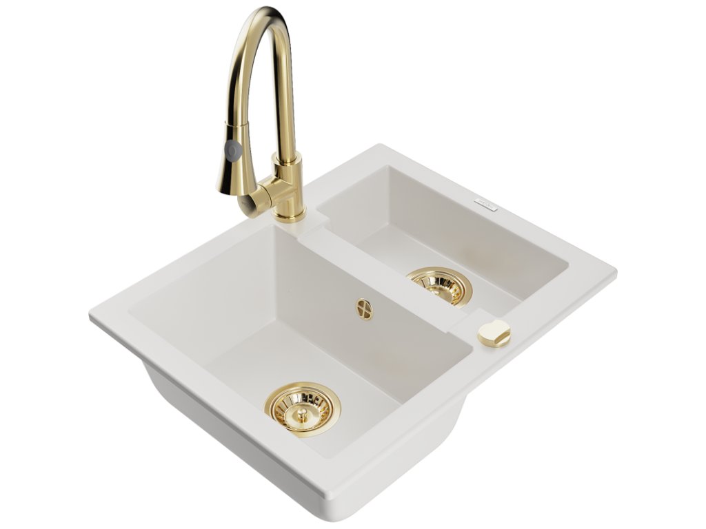 Granitový drez Mexen Carlos s 1,5 miskou a kuchynskou batériou Elia, biely - 6518-20-670101-50