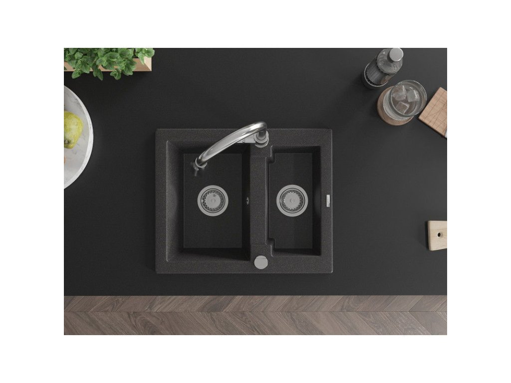 Granitový drez Mexen Carlos s 1,5 miskou a kuchynskou batériou Elia, čierna škvrnitá - 6518-76-670101-00