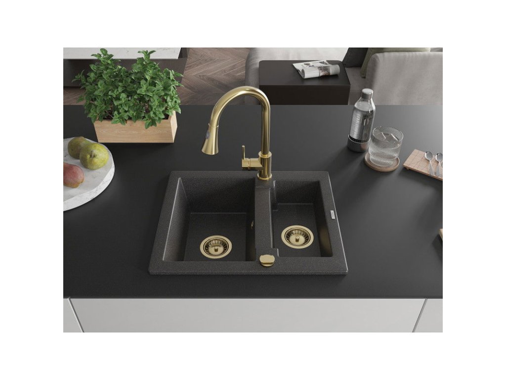Granitový drez Mexen Carlos s 1,5 miskou a kuchynskou batériou Elia, čierna škvrnitá - 6518-76-670101-50