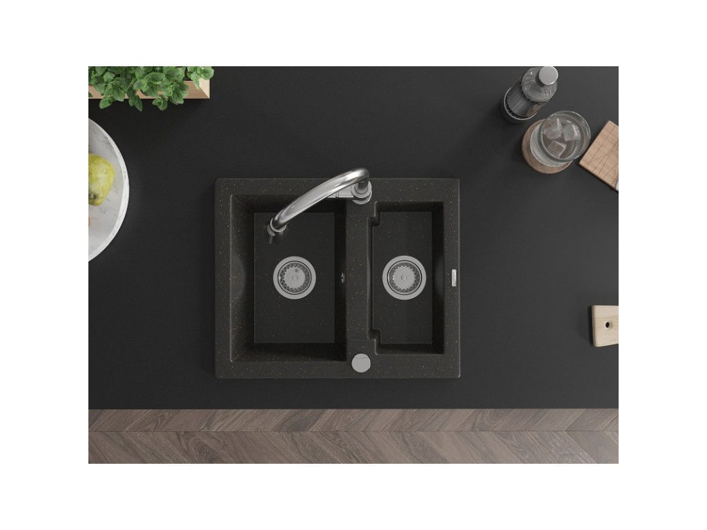 Granitový drez Mexen Carlos s 1,5 miskou a kuchynskou batériou Elia, čierna/zlatá metalíza - 6518-75-670101-00