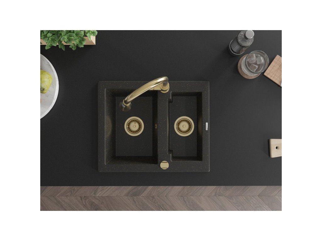 Granitový drez Mexen Carlos s 1,5 miskou a kuchynskou batériou Elia, čierna/zlatá metalíza - 6518-75-670101-50