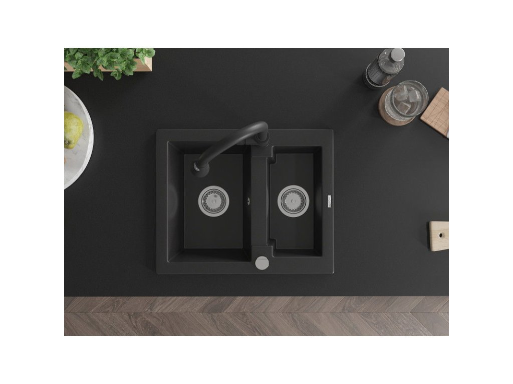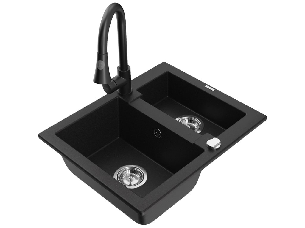 Granitový drez Mexen Carlos s 1,5 miskou a kuchynskou batériou Elia, čierny - 6518-77-670101-70