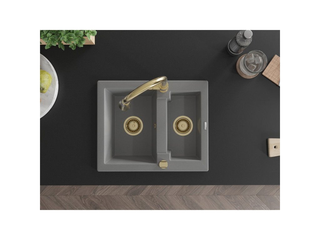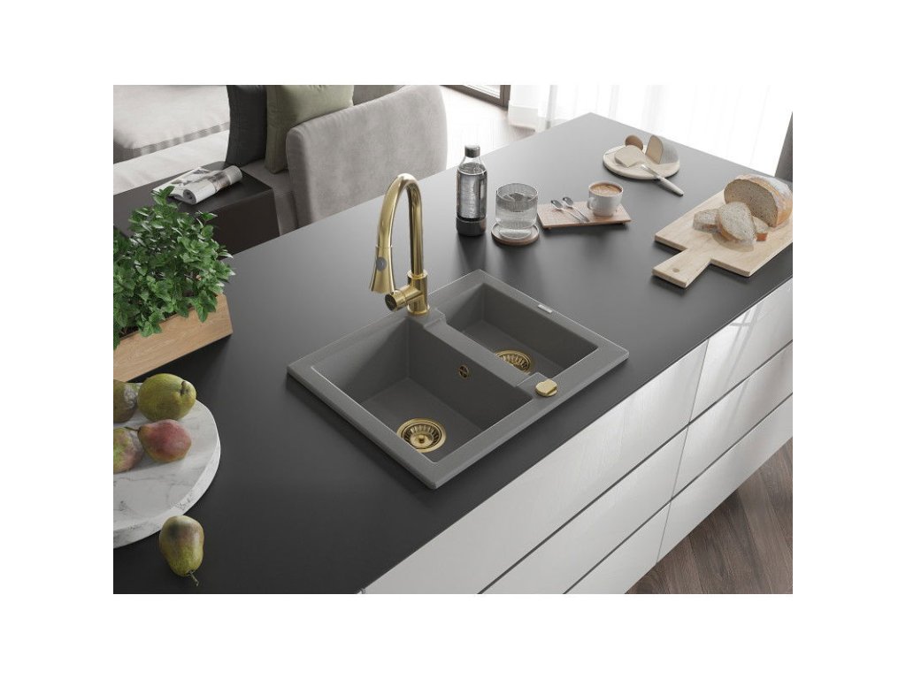 Granitový drez Mexen Carlos s 1,5 miskou a kuchynskou batériou Elia, sivý - 6518-71-670101-50